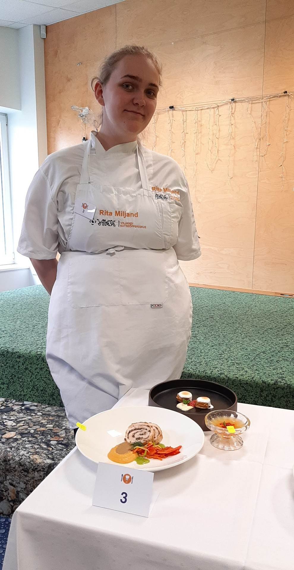 Birgit Vainu Olustvere TMKst. Suur tänu tiimikaaslastele! Võistlejad pidid neljatunnise võistlusaja jooksul valmistama etteantud toidukorvi kasutades pearoa, magustoidu ja üllatustoidu.