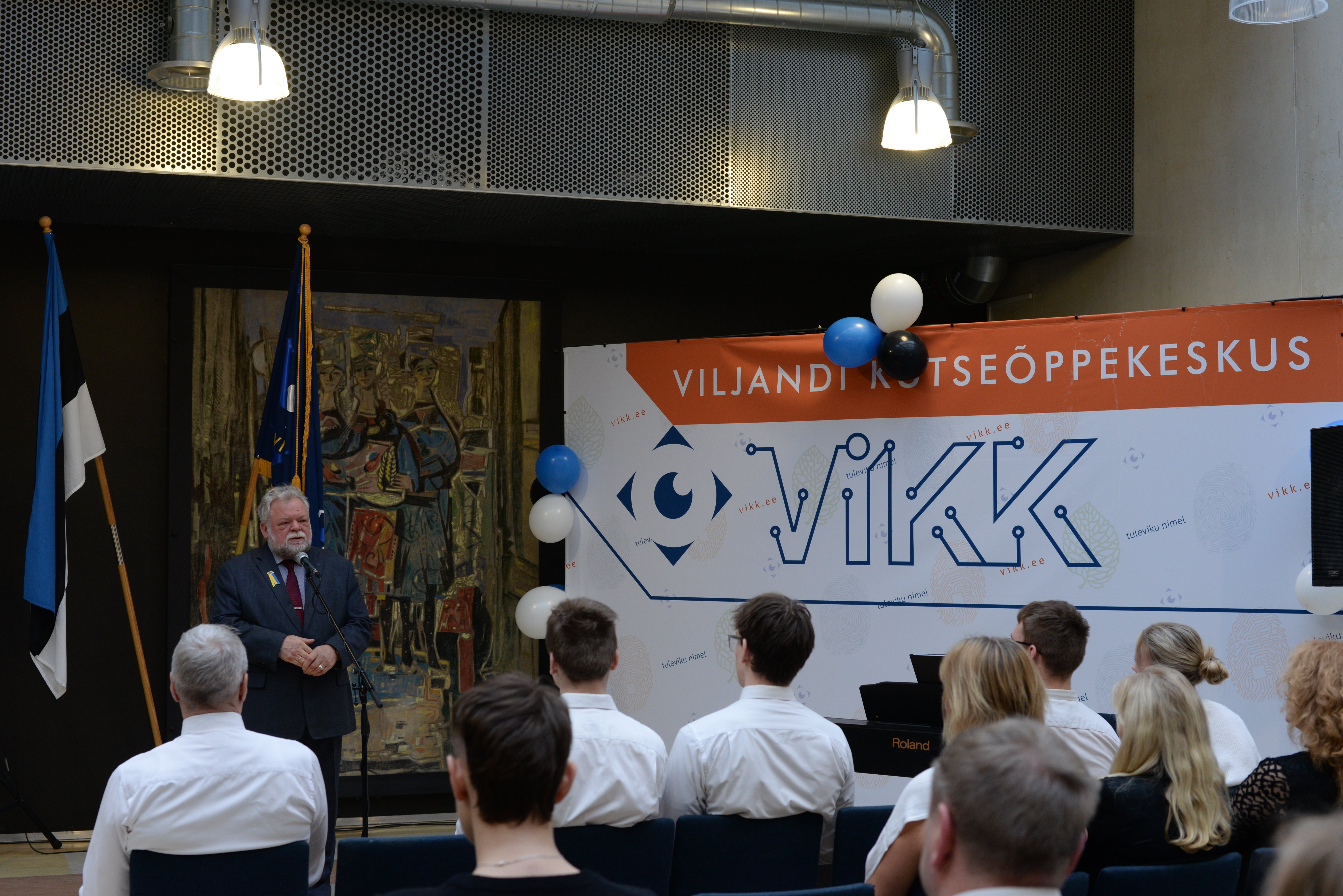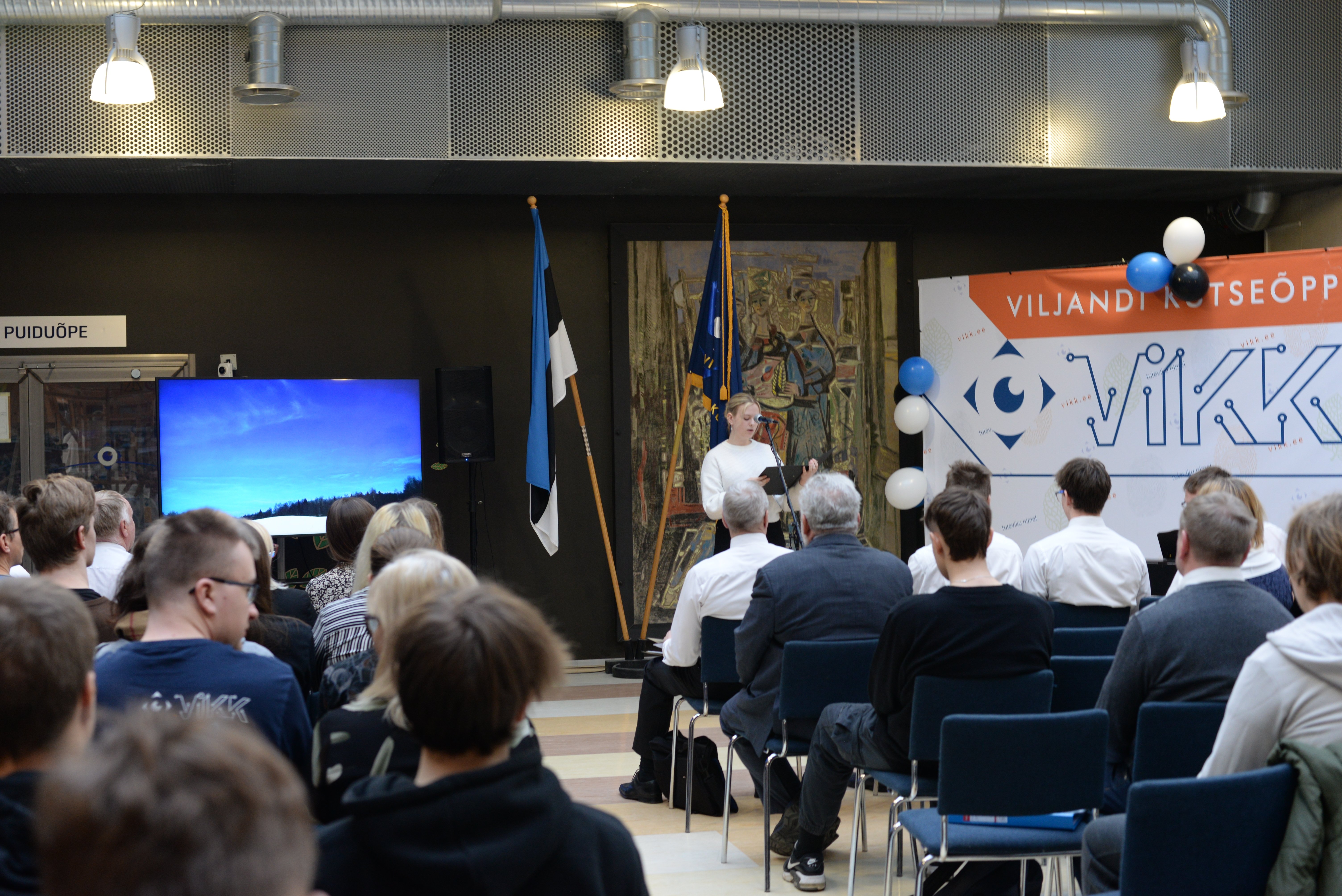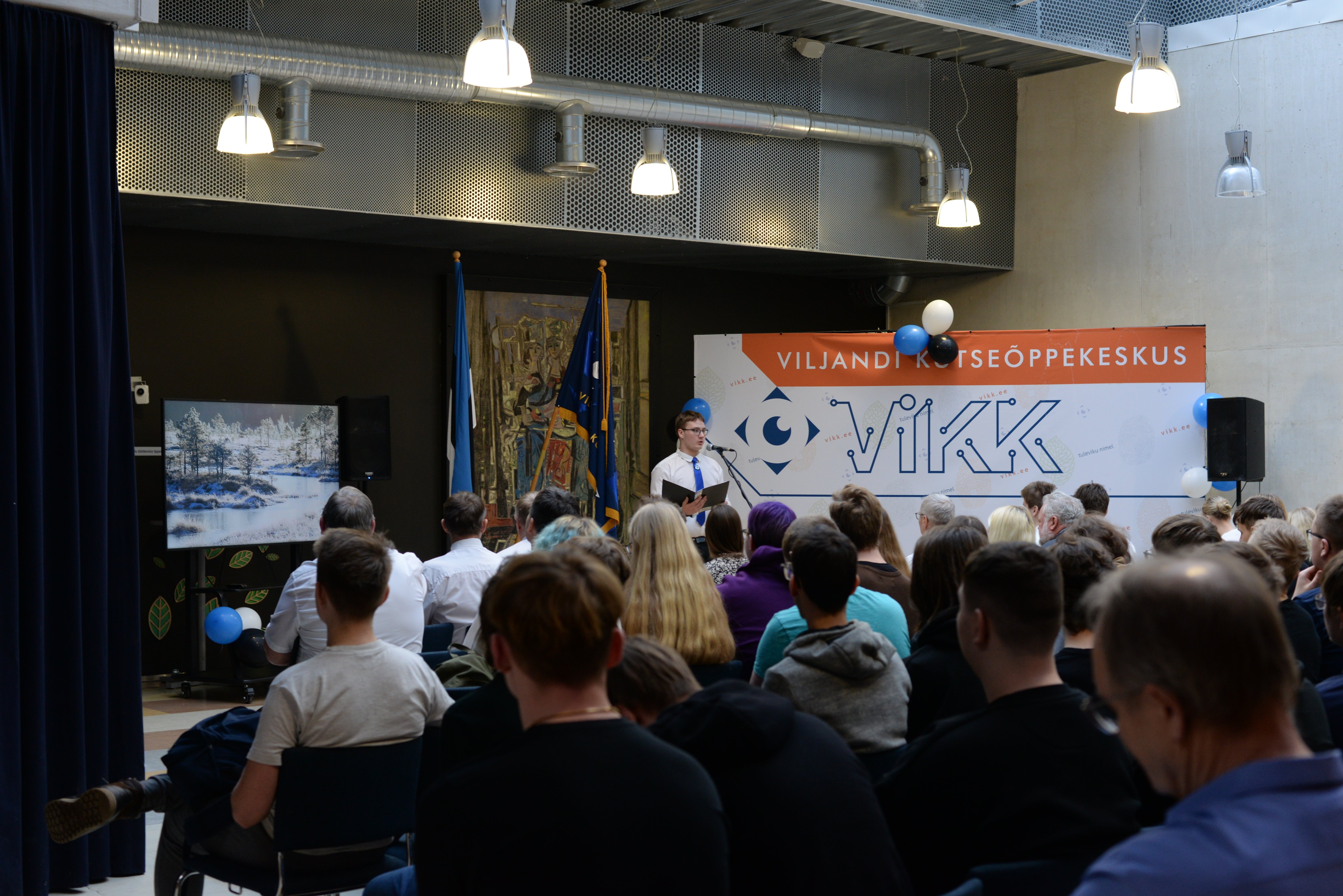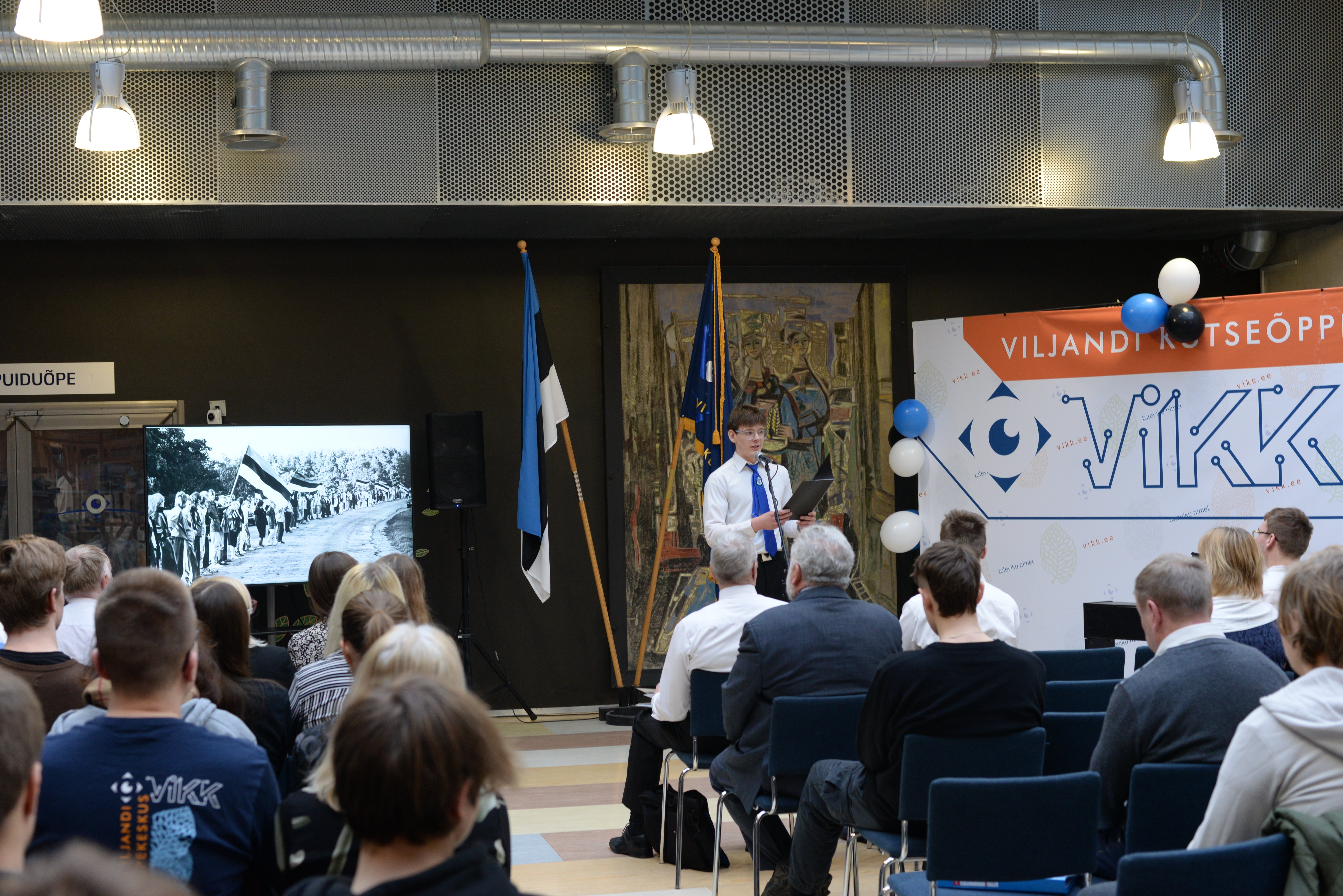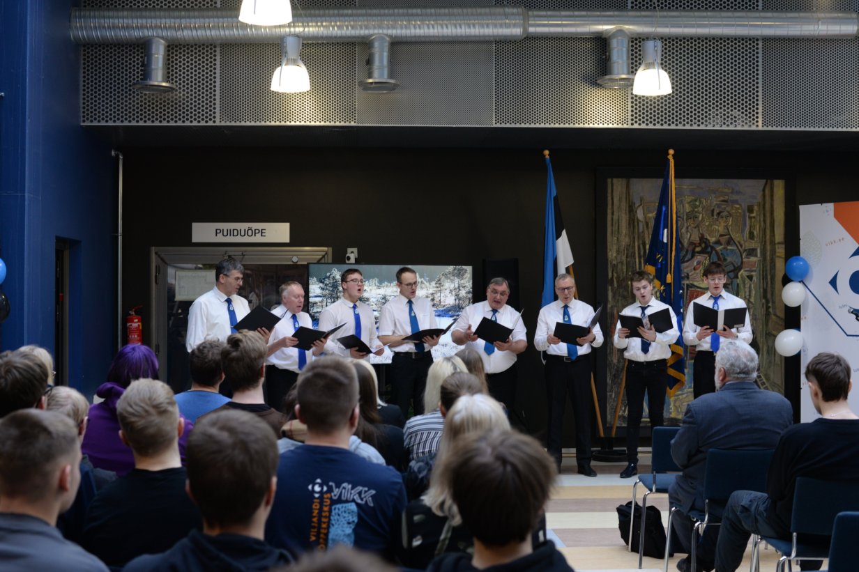 Viljandi Kutseõppekeskus võttis väärikalt vastu Eesti Vabariigi 106. aastapäeva kutsudes kogu koolipere aatriumisse pidulikule aktusele aastapäeva eel.
