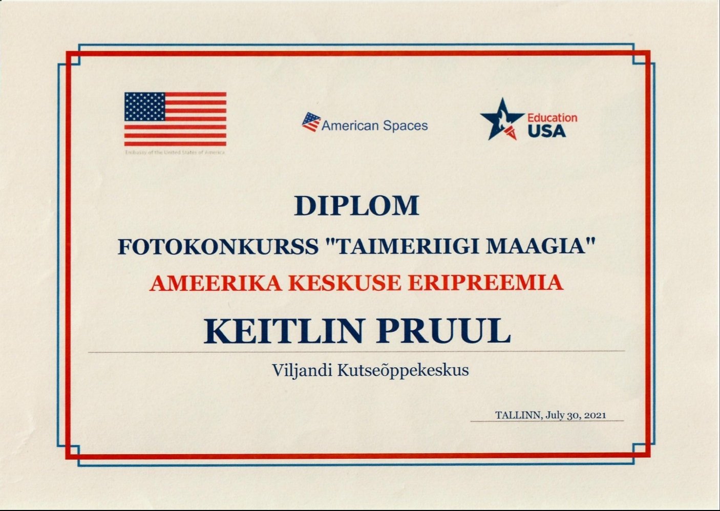 Suve alguses kuulutasid USA Saatkond Eestis, Ameerika keskus ning Põhja-Ameerika ülikoolide teabekeskus välja fotokonkursi "Taimeriigi maagia". Meie kooli automaalri eriala õpilane Keitlin Pruul pälvis Ameerika keskuse eripreemia. Palju õnne!